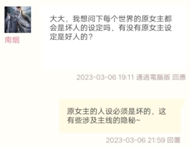 大大我想问下每个世界的原女主都会是坏人的设定吗,有没有原女主设定是好人的?
