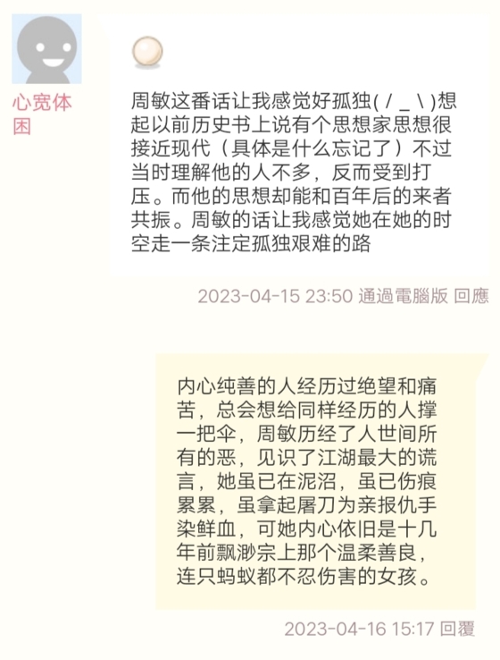 内心纯善的人经历过绝望和痛苦,总会想给同样经历的人撑一把伞,周敏历经了人世间所有的恶,见识了江湖最大的谎言,她虽已在泥沿,虽已伤痕累累,虽拿起屠刀为亲报仇手染鲜血,可她内心依旧是十几年前飘渺宗上那个温柔善良,连只蚂蚁都不忍伤害的女孩。