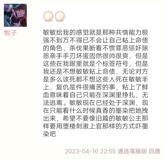 敏敏给我的感觉就是那种共情能力极强不到万不得已不会让自己粘上命债的角色,杀伐果断看不惯罪恶惩奸除恶亲手手刃坏蛋固然很帅很爽,但是这些在我眼里就是个标签符号,但是我还是不想敏敏粘上命债,无论对方是多么该死都不想这些人死在敏敏手上,复仇是件很痛苦的事粘上了鲜血意味着自己只能在深渊里挣扎,无法逃离。敏敏现在已经处于深渊,现在只能看什么时候真香的墨染把她拽出来,希望不要像旧篇的敏敏公主那样要用坠楼刺激上官那样的方式吓墨染吧