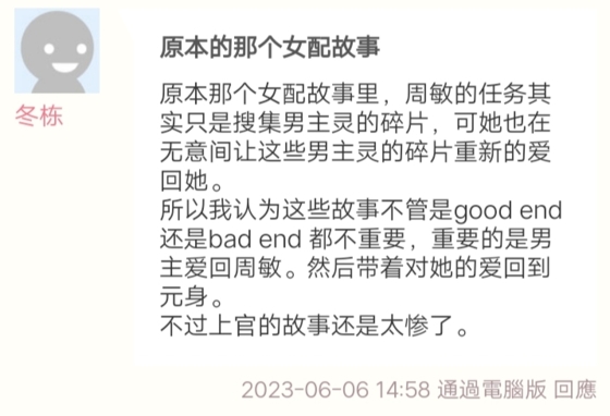 所以我认为这些故事不管是good end还是bad end 都不重要,重要的是男主爱回周敏。然后带着对她的爱回到元身。