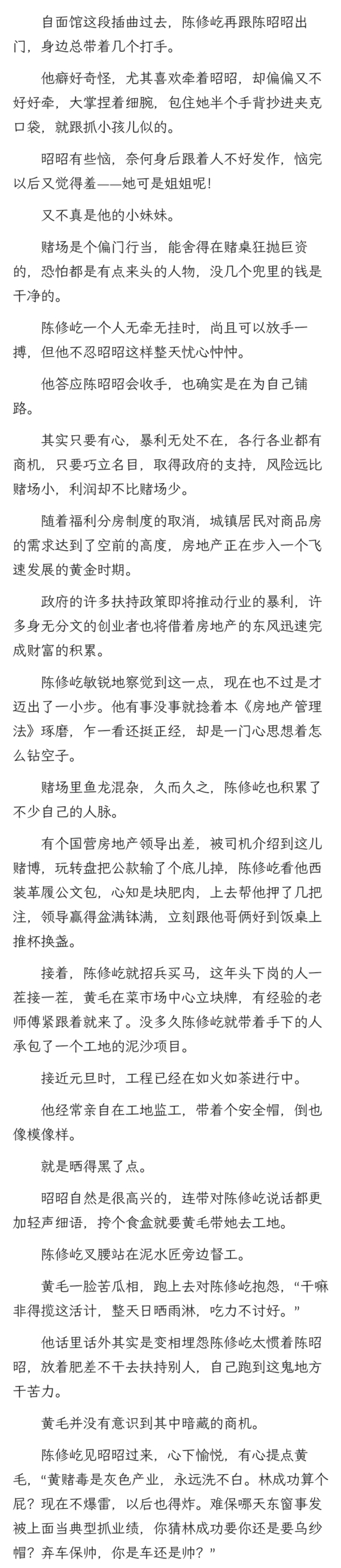 陈修屹冷了脸色,一铁锹铲在他屁股上,“没出息的东西。你现在说得豪迈,以后老了呢?五十岁六十岁还能这样信誓旦旦?刘三刀现在从不亲手沾人命,你真指着出了事还跟人家是一条贼船呢?你也知道他以前干的什么营生勾当,哪点不比你果敢杀伐?现在还不是跑到这小地方躲清净,为什么?年纪大了,有钱有权了,自然惜命。何况他还有个姐姐,宝贝得很。若是又赶上严打出事,你信不信他随时抽身绝不保你。同样,阿宇,你以后富贵了,成家了,也会更加惜命。你想干什么我都不拦你,要跟刘三刀还是跟我,都随你,只是哥哥我看重你,想你早日抽身从别处谋富贵。现在政策好了,大家的日子有盼头,你去市里转一圈,多少张罗着想买房的,商品房要装修,咱们就可以承包工程,凭我们在这儿的势力和人脉,把风险降低,何愁银行不放贷,到时候做大了,钱还不是照样滚滚来,你何必吊着命在赌场闯鬼门关?”