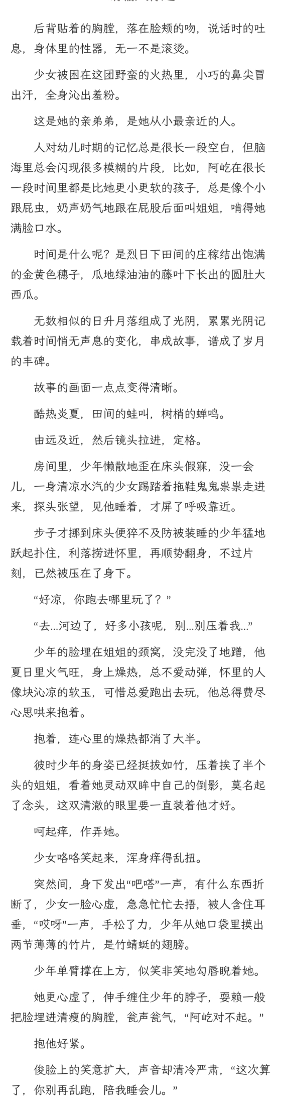 他不再用年少时的竹蜻蜓讨好姐姐,他终于,终于放任汹涌欲望在姐姐湿软的秘径中放肆地胀大,激狂地挞伐。