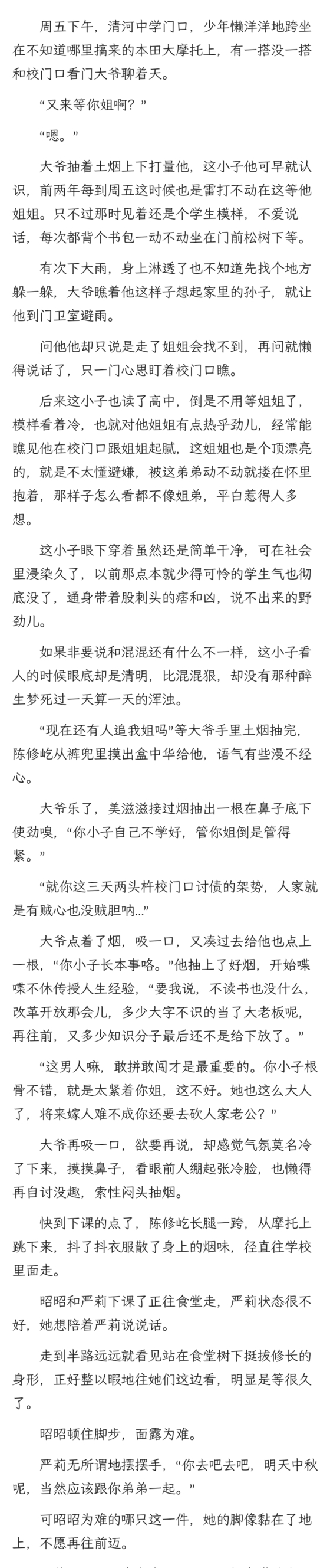 她并没察觉昭昭的异样,只心里想着那天陈修屹既然也在那里,那搞好关系肯定没错,于是便一股脑拉着昭昭往前走,把人推到陈修屹面前,走之前还不忘在耳边道,“记得帮我问问。”