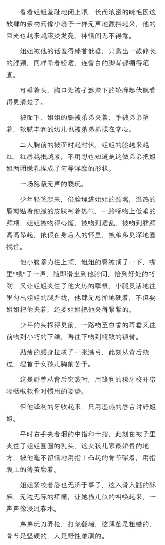但这汁液是滑的腻的,会不受控制地从她腿心间潺潺往外冒,会让她的内裤都湿透,会弄湿弟弟的性器,再黏上弟弟的性器,两个人都变得像泥鳅一样滑……暧昧糜丽的气息会从她的下身漫散到整个房间,然后,弟弟会低低地笑她,他说,“陈昭昭你流口水都止不住了是吧。”