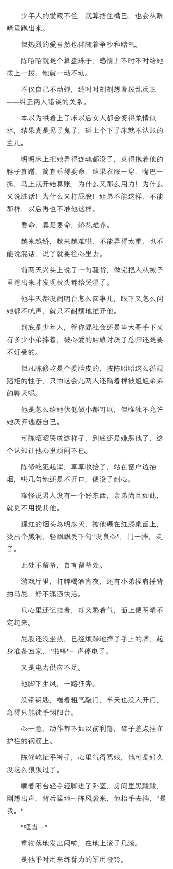 一个单纯,一个早熟,在性事上简直是鸡同鸭讲。他兴头上在床上的一句荤话在她眼里便成了天大的不尊重,不珍惜。