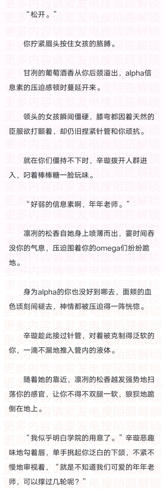 辛璇嘴角弧度上扬,眼底恶意弥漫,忽然停了挑逗,笑眯眯道:“年年老师不如求求我,或许我可以考虑借个omega给你舒缓一下。”