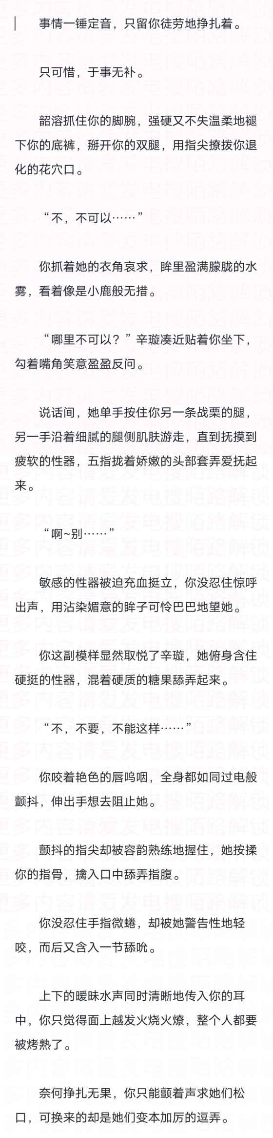“这可不行哦,年年老师。”辛璇松了口抬眸笑意盈盈看你,眼底翻涌的恶意毫不遮掩,用沾满晶莹津液的唇一开一合道,“要懂得节制呢,年年老师。”